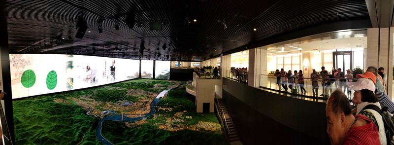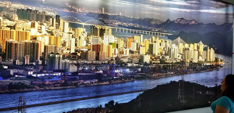 遊覽完三峽大壩後我們在另一個展示廳看城市的開發,我們正在觀看熒幕上的視頻。