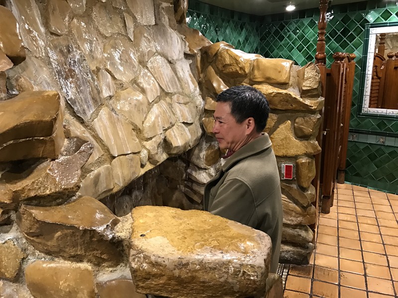 金波在 Madona 旅館的男廁裡一方面解决民生問題, 另方面欣賞廁内的小瀑布。
