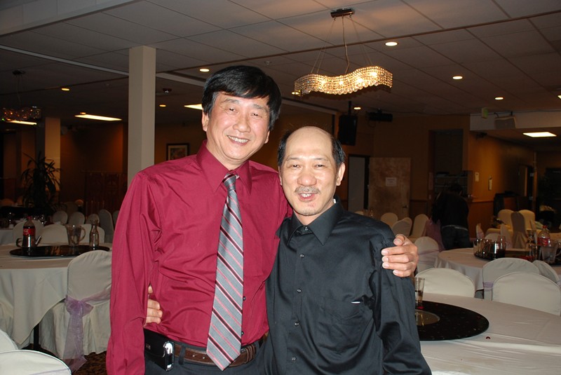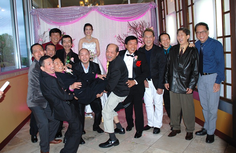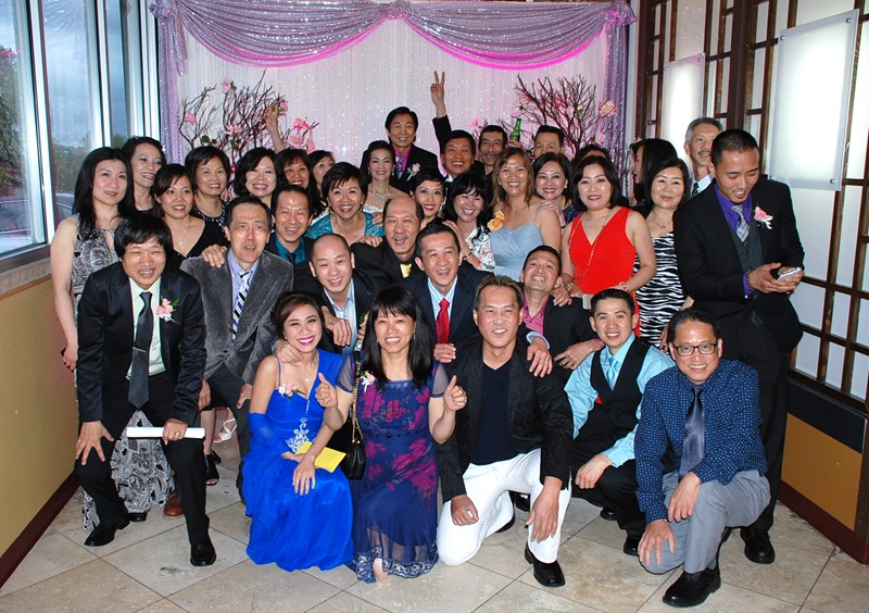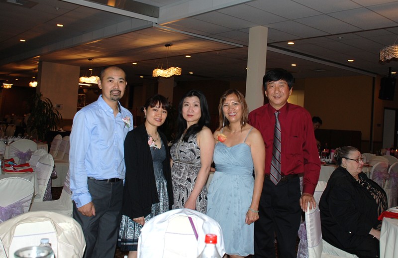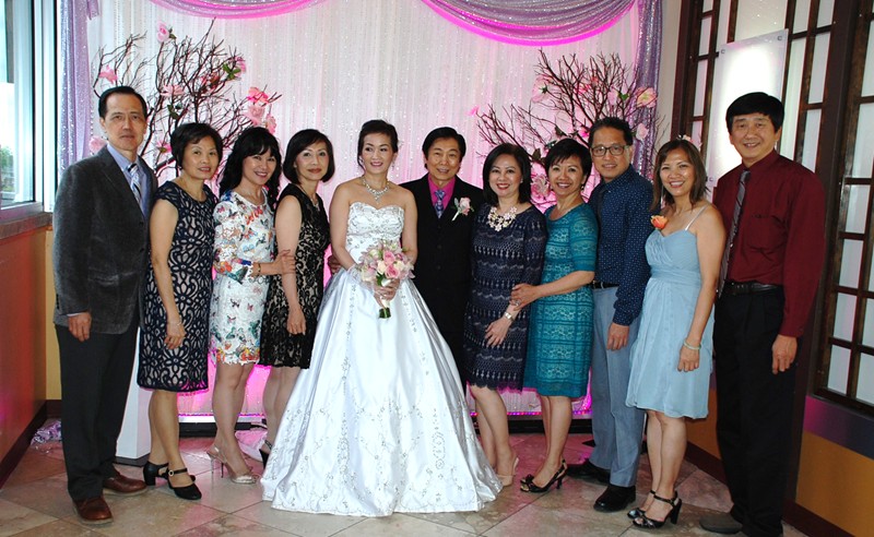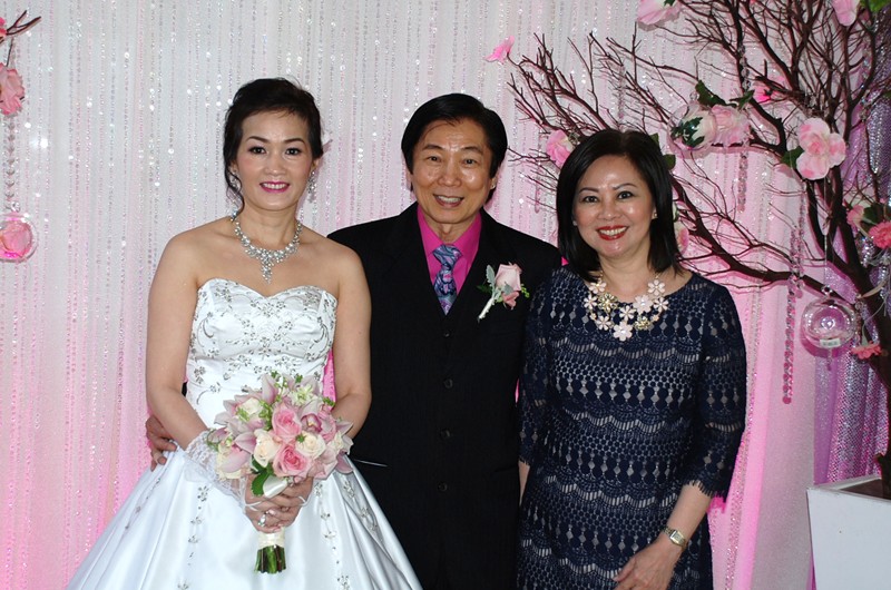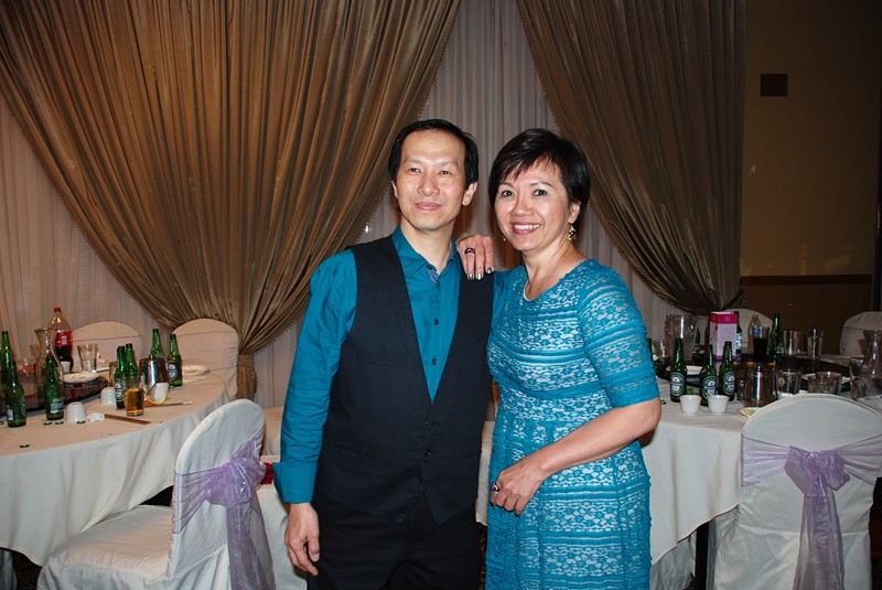 潘正英老師和張老師夫婦應邀參加婚宴。潘老師帶上樹人校徽胸章, 他的心永遠是樹人心!