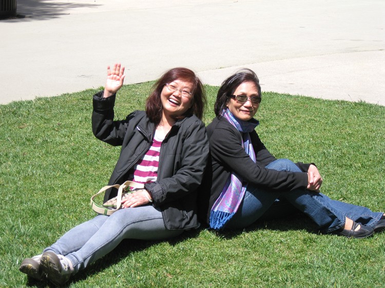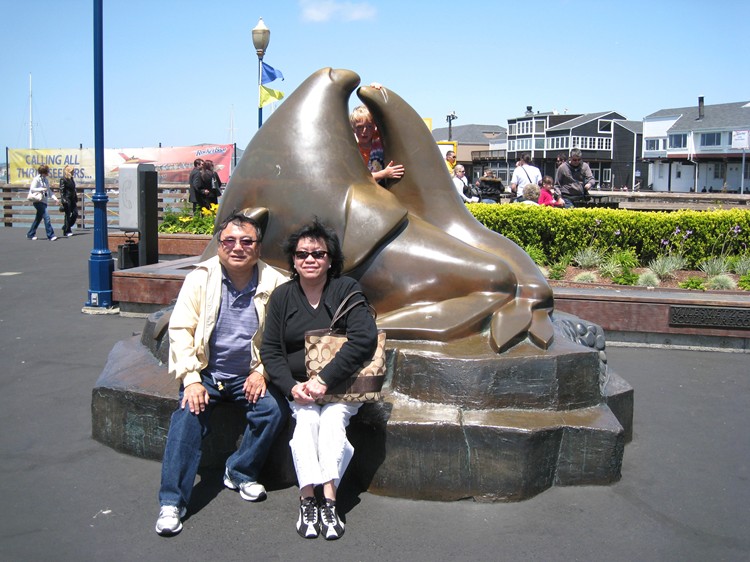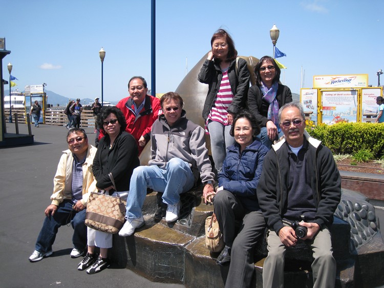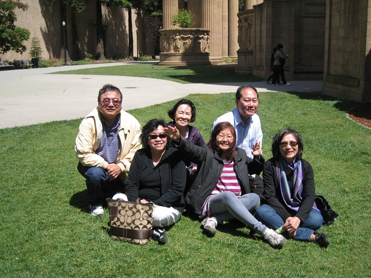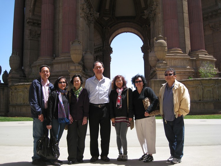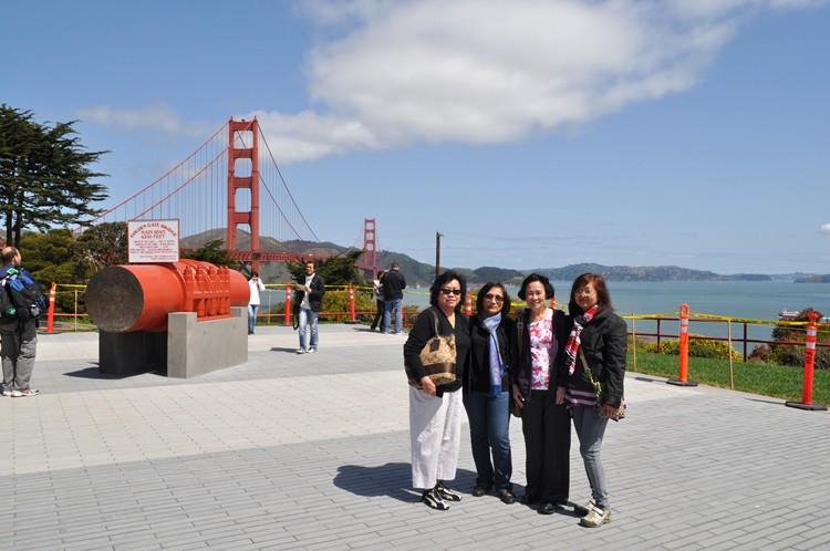 洪德恩伉儷探訪三藩市,杜碧珠伉儷與幾位斌社班同窗陪同前往三藩市各景點遊覽。 三藩市金門大橋前:蔣志昌、李艷芳、洪德恩伉儷、杜碧珠、譚美珠。