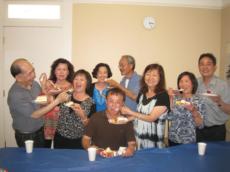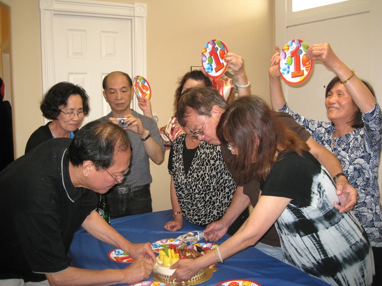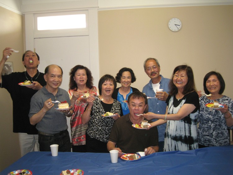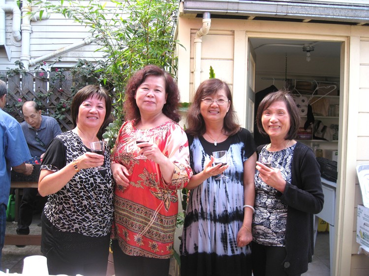 除了主人翁夫婦的沙拉與 Bar b Que ,参與的其他的同學也都没閒着,大家都主動各自捧上一道食物或提供娛樂節目一項。碧珠與强哥帶來了炒麵與炒米粉,麗萍煮了一大鍋 Banh Canh,志昌精選的生日蛋糕,(當日亦是艳芳的先生润棠兄之生日,我們亦有為他簡單,隆重慶生),璇珠帶來了自製的補身龜苓膏與煮花生,還有我帶來的月餅等。強哥另外還帶來幾瓶红酒與咖啡,包羅萬象,五味雜陳的各種食品飲料,也真足夠讓我們分好幾餐來逐一品嚐。娛樂方面,歌后麗萍一首接一首的古今名曲,婉轉繞樑的唱功令人陶醉不己,另外我們首次領教了步雲兄與潤棠兄的“有味笑話”,這些笑話也不知是怎麽開始的,反正有某人始作俑者,接着就一發不可收拾,這幾位仁兄的幽默感與講笑話的吸引力,我還真是甘拜下風,自嘆不如呀。