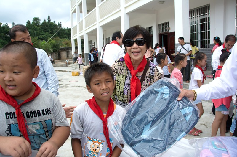 王永健代表『樹人建樹人愛心計劃』贈送『樹人心』給希望工程的魏潔,感謝她為興建樹人小學所付出的心血。