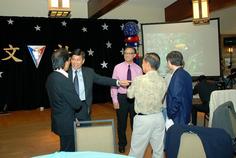 潘正興那麼高興和舊同學握手談笑也是晚會奇景之一。 文社班同學的精誠團結和友情的背景是可據的, 班主任葉能裘老師扮演著超