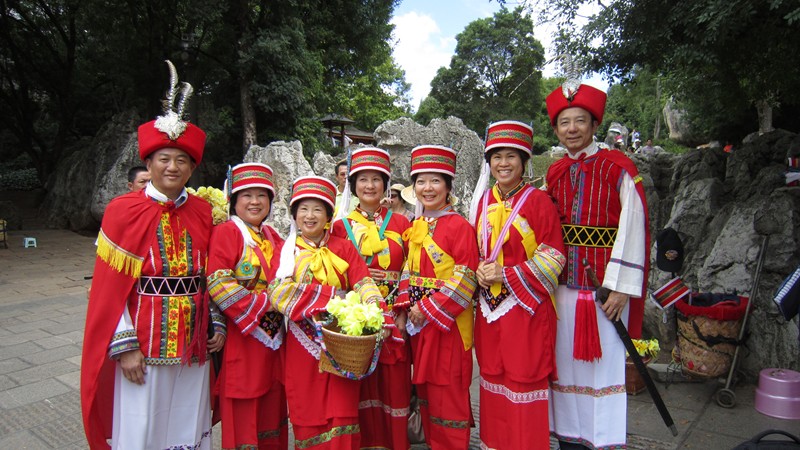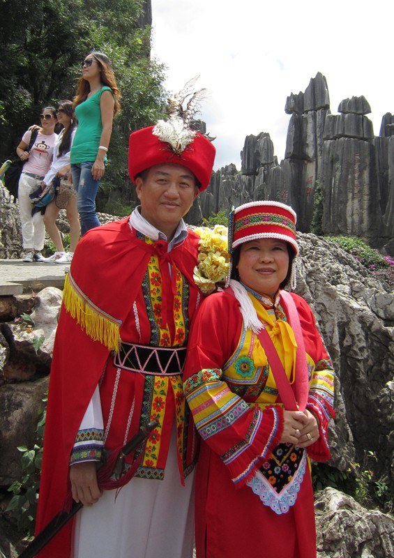 這是中國少數民族彝族的傳統服裝,每套出租十元人民幣(大約一塊六美金),新的,當拍完照後,我們多給十塊錢,這些少數民族婦女堅持不要,她們民生樸素,非常誠實。