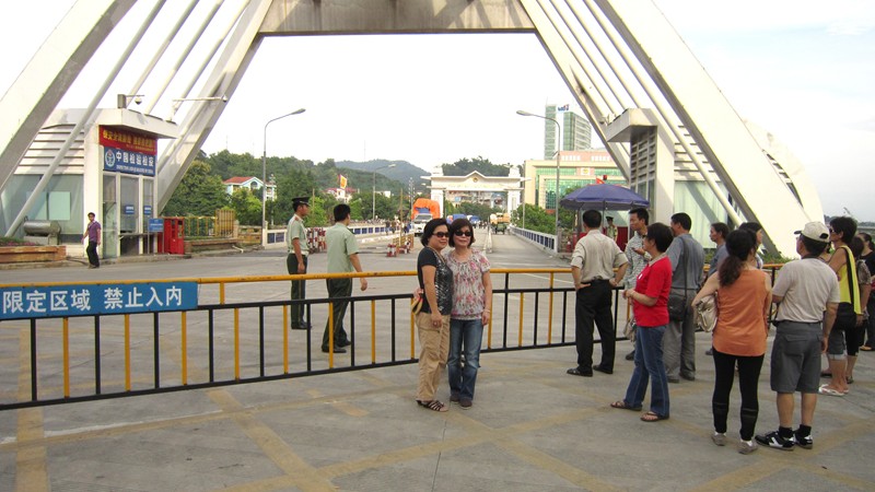 如果不留意的話,你也許還不曉得我兩腳踏在中越國土的兩邊,腳下的那條線就是橋上的『中越邊界』。